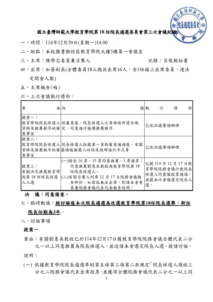 114-12-30 【院長遴選】第18任院長遴選委員會第3次會議紀錄