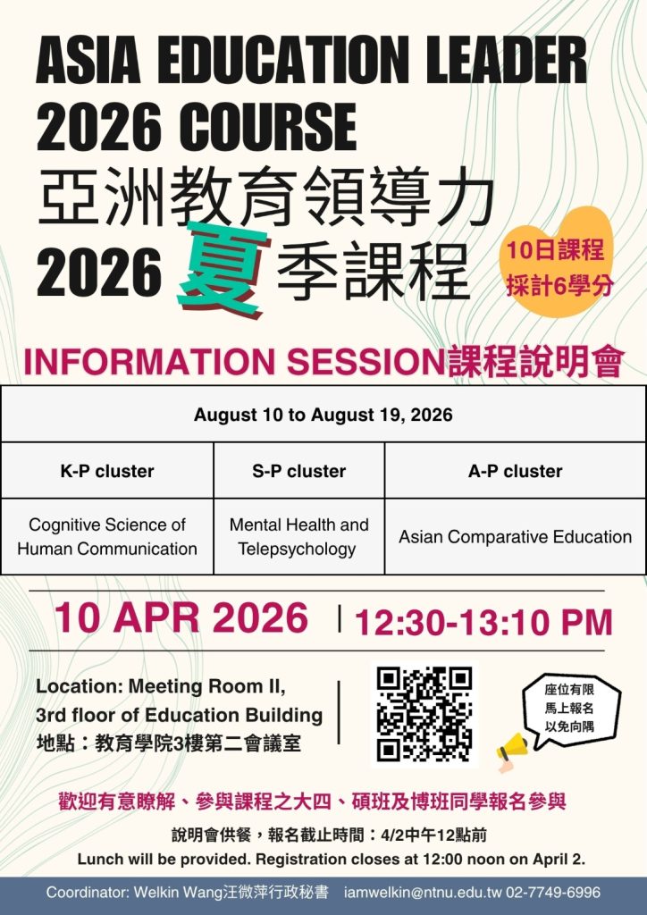 其他資訊可見本院AEL頁面:https://www.coe.ntnu.edu.tw/index.php/internationalization/aelc/